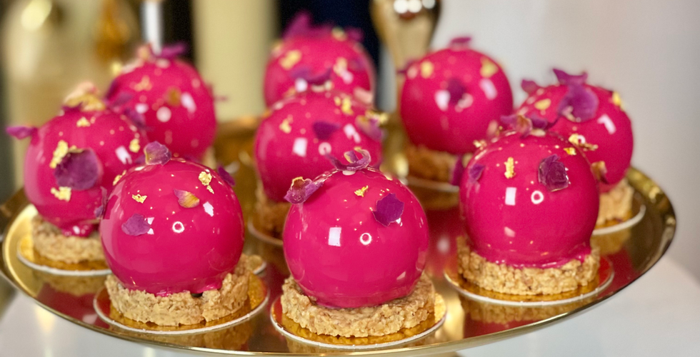 Aksamitny krem z infuzją z herbaty Earl Grey i mleczną belgijską czekoladą / płynne nadzienie ze świeżą marakują, kawałkami mango i cytrusową skórką/ chrupiąca kruszonka z francuskimi prażynkami i orzechami laskowymi/ polewa lustrzana "mirror glaze"